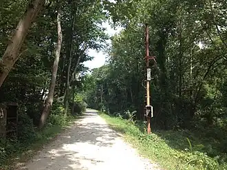 ![]() Pennypack Trail north of Lorimer Park, with a former railroad signal pole visible | |