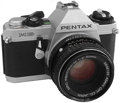 The Pentax MG is an entry-level, interchangeable lens, 35mm film, single-lens reflex (SLR) camera manufactured by Asahi Optical Co., Ltd. from 1981 to 1985. It was introduced as the successor to the Pentax MV and MV1 cameras.[1]