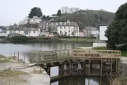 Pentewan was originally known as 'Lower Pentewan', 'Higher Pentewan' being a separate and earlier settlement to the south-west of the village, centred on Barton Farm.[2] In 1086, Higher Pentewan was listed in the Domesday Book as the Manor of 'Bentewoin', one of many Cornish manors held by Robert, Comte de Mortain. It was subsequently held by the families of Pentire, Roscarrock, Dart, and Robartes (the Earls of Radnor), then by Sir James La Roche, the MP for Bodmin (1768–80), and (in 1792) by the Rev. Henry Hawkins Tremayne of nearby Heligan.[8]