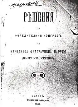 The People's Federative Party (Bulgarian Section) (Bulgarian: Народна федеративна партия (българска секция)) or just People's Federative Party (PFP) (Macedonian: Народна федеративна партија (НФП)) was a Bulgarian political party in the Ottoman Empire, created after the Young Turk Revolution, by members of the left-wing of the Internal Macedonian Adrianople Revolutionary Organization (IMARO).[1][2][3] The Party decided to name itself Bulgarian Section, since it was hoped that other nationalities from European Turkey would adopt its program and form their own ethnic sections, but this didn't happen.[4] Per its statute members of the Bulgarian Section could be Bulgarians, who are Ottoman citizens, at least 20 years old.[5] It functioned for one year from August 1909 until August 1910.[6] Their main political rival was the Union of the Bulgarian Constitutional Clubs.