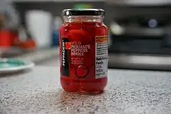 Peppadew is a trademarked brand name of South African food company Peppadew International (Pty) Ltd. for a pickled version of the Juanita pepper.[1] Peppadew International produces and markets a variety of food products under the Peppadew brand, including jalapeño peppers, Goldew peppers, pickled onions, hot sauces, pasta sauces and relishes, but is best known for its sweet piquanté pepper (a cultivar of Capsicum baccatum) grown in the Limpopo province of South Africa.[2]