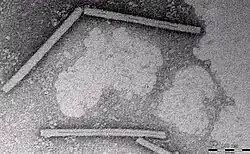 Pepper mild mottle virus is the major viral pathogen of peppers (Capsicum spp.).[4] The host range of PMMoV include most cultivars and species of pepper (Capsicum spp.). This virus strain does not infect tomato, eggplant, or tobacco; however, other members of the genus Tobamovirus can infect these other hosts.[5] PMMoV is one of at least 4 different species of Tobamovirus that infect peppers.[6] The others include Tobacco mosaic virus (TMV), Tomato mosaic virus (ToMV) and Tobacco mild green mosaic virus (TMGMV).