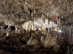 It is famous for its cave, known as the "Cave of Perama" (Greek Σπήλαιον Περάματος). The cave, extending five kilometres below the ground and having been explored fully only up to one kilometre, has a remarkable arrangement of stalagmites and stalactites. An 11th-century church in the town dedicated to Saint Haralambos and reputedly built by Byzantine Emperor Alexius Comnenus is in a bad state of repair and is rarely open to the general public. The town lies on GR-6 between Igoumenitsa and Metsovo.