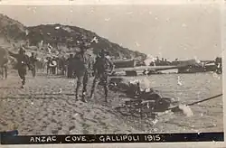 After almost four months at Camp Mena the Company sailed from Alexandria to Mudros Bay on the Greek island of Lemnos.[13] This was the staging post for Gallipoli, 100 km to the north-east. Here they constructed sledges for conveying materials ashore. They took on board casks of water, timber, shovels and barbed wire. Their ship arrived off Anzac Cove before dawn on 25 April 1915, and the company landed early that morning.