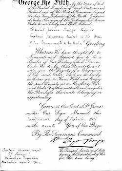 In late July 1916, he fought at the Battle of Pozières[23] (part of the Battle of the Somme), for which he was awarded the Distinguished Service Order (19 August 1916).[24][25] He was chosen (together with Colonel J.A. "Reg" Robinson) to represent the first AIF at an award ceremony in Buckingham Palace. He received the DSO from George V. The DSO was: