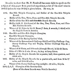 Furnivall was a champion amateur bicyclist, tricyclist, and tandemist in the 1880s and won 11 prizes during a tour of the United States.[4] In 1886 he was the champion one and five-mile bicyclist, and in 1887 was the record-holder for the quarter-mile bicycle race. He wrote an early book on athletic performance, Physical Training for High Speed Competitions, that was published in 1888.[4]