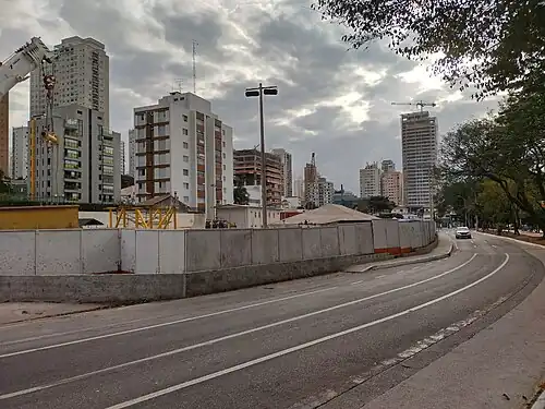 The construction of the station began in 2016, when the opening date was estimated to mid-2020.[2] Later, Governor Geraldo Alckmin promised the opening of the first phase of the line to 2020, time which was discarded due to a year of delay in the financing of the Federal Savings Bank, which would be used for the expropriations. In June 2016, the opening of the line was estimated for 2021,[3] time kept in October 2017, when the resume of the construction was announced for the beginning of 2018.[4][5][6] Currently, the construction is suspended, due to the involvement of the construction companies of the Move São Paulo consortium (Odebrecht, Queiroz Galvão, UTC Participações) in Operation Car Wash, which caused them to not get the financing of R$ 5.5 billions (US$ 1,575,344,427.58) with the Brazilian Development Bank (BNDES) for the continuity of the construction. The State Government of São Paulo is currently in negotiations with international companies, including Spanish Acciona[7] and Chinese China Railway Construction Corporation.[8]