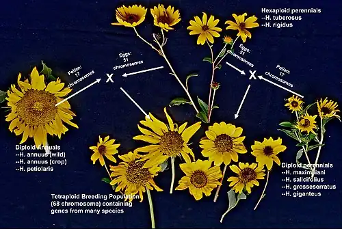 Many sunflower species can be artificially hybridized but one group of wild perennial species cross; the hexaploids (six copies of all chromosomes instead of the usual two copies) are especially easy to cross. Scientists are using this group to make “bridging crosses” that will bring together the genes from the crop sunflower and several other perennial species.