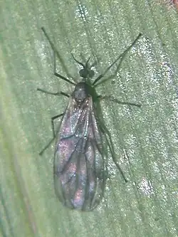 The Perissommatidae are a family of flies (Diptera) that was proposed in 1962 by Donald Colless based on the species Perissomma fusca from Australia. The family now includes five extant species within the single genus Perissomma, four from Australia and one from Chile. The Perissommatidae are unusual as they appear to have four compound eyes. They have a small slender body less than 2 mm in length. Their wings are large in comparison to their bodies and subsequently their flight is weak. Preferring high-altitude forest environments, adults only fly in the winter. The larvae live in decaying leaf litter in wet sclerophyll or cool rain forests. Some species are suspected to be associated with fungi. In the case of Perissomma macalpinei, numbers of adults have been observed congregating in clumps of foliage and rising in short, zigzag flights in the sunlight above the foliage for short periods before descending.[3][4]