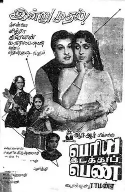 Periya Idathu Penn (transl. The Wealthy Woman) is a 1963 Indian Tamil-language romantic comedy film, directed by T. R. Ramanna. The film stars M. G. Ramachandran, B. Saroja Devi, M. R. Radha and T. R. Rajakumari. It was released on 10 May 1963. The film was blockbuster, the highest-grossing film of the year and ran more than 100 days. The film was remade in Telugu as Sabhash Suri and in Hindi as Jawab.[1][2] The story of the 1982 Tamil film Sakalakala Vallavan was also inspired by this film.[3]
