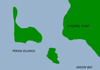 The Peron Islands are two low-lying islands off the west coast of the Northern Territory of Australia. They are about 5 km off Channel Point. Channel Point forms the northern end of Anson Bay which includes the mouth of the Daly River.