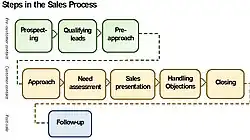 The first text to outline the steps in the selling process was published in 1918 by Norval Hawkins.[18] The basic steps, which have changed only a little since Watkins first proposed them, are prospecting, qualifying leads, preapproach, approach, need assessment, presentation, meeting objections, closing the sale and following up.[19]