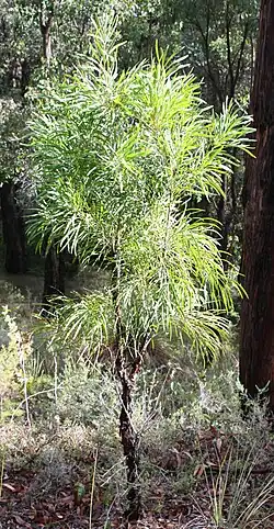 In addition to being used for minesite restoration, P. longifolia is used in the cut-flower trade, being valued for its weeping appearance and durability. It also has potential in the nursery trade for its symmetrical habit, weeping foliage and textured, flaky bark, but studies have suggested that at least eighteen months of soil burial is required for seed germination.[6]