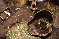 The female frog lays her eggs on the leaf litter. After the eggs hatch, the adult frogs carry the tadpoles to water.[2][1]
