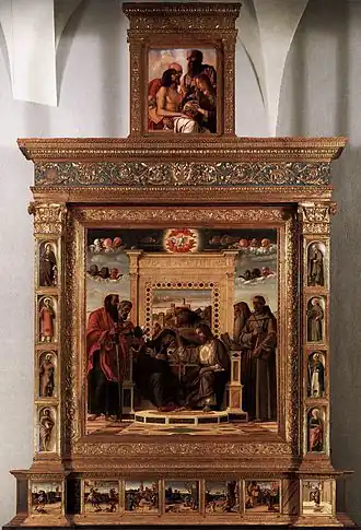 The Pesaro Altarpiece (Italian: Pala di Pesaro) is an oil-on-panel painting by the Italian artist Giovanni Bellini, dated to some time between 1471 and 1483. It is considered one of Bellini's first mature works, though there are doubts on its dating and on who commissioned it. The work's technique is not only an early use of oils but also of blue smalt, a by-product of the glass industry. It had already been used in the Low Countries in Bouts' 1455 The Entombment, but this marked smalt's first use in Italian art, twenty years before Leonardo da Vinci used it in Ludovico il Moro's apartments in Milan in 1492. Bellini also uses the more traditional lapis lazuli and azurite for other blues in the work.[1]