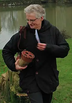![]() Fleming playing a medieval Echo Horn, c.2015 | |