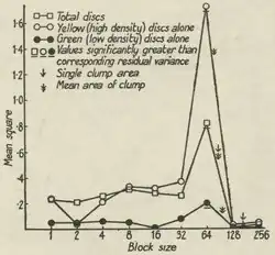 In different papers,[27][28][29][30] he showed the importance of scaling in the measurement of plant spatial pattern. He understood that researchers sampling the same vegetation with quadrats of different size could reach diametrically opposed conclusions: a researcher using small quadrats would find that his quadrats harbor either clumps or no plants at all, and would conclude that the species pattern in space follows a clumped distribution. Similarly, a researcher using large quadrats would find a similar number of clumps in each quadrat and would conclude that the species distribution is markedly regular. In reality, both would be right because a species can have a strongly clumped distribution at a certain scale and a regular distribution at another. As president of the British Ecological Society, he wrote an address in 1979,[31] in which he summarized his ideas on the importance of scaling in ecological spatial pattern. Some of his students took his ideas and pursued them further: Mark Hill developed a rigorous mathematical theory for the analysis of pattern at a community level,[32] while Kenneth A. Kershaw, after publishing in co-authorship with Greig-Smith, continued exploring for years the drivers of pattern at different scales.