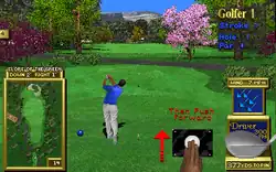 The PSX and PC games (which happen to be one of the only home ports of the Golden Tee series), simply called Peter Jacobsen's Golden Tee Golf are based on Golden Tee '97, sharing some of the menu assets (which are already shared on most revisions of the game) and the courses on it, but also include 3 new extra courses. The PSX version includes some extra modes and hole overviews on the start of each hole, but as there isn't any analog controller for PSX (by default), the trackball controls were replaced, as you hold Down in the D-Pad to adjust the power of your backswing (The game also seems to have support for Dualshock). Meanwhile, the PC version had support for LAN and Online, as well as Shadow Games that you could save and share to then play with a player from a previously saved shadow game as if it was playing with you. It also uses the mouse for analog input, allowing you to move the mouse backwards to adjust the backswing, and then forward to swing it (you can adjust the hit to make it go leftmost or rightmost if you move the mouse forward and to one of the two directions).