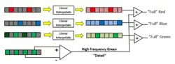 Dillon incorporated this 100 x 100 pixel color image sensor in the world's first single-chip color video camera, which he described in an IEEE paper published in February 1978.[2] Dillon and Bayer invented the image processing algorithm and circuitry used in the camera, which is described U.S. Patent No. 4,176,373.[13] This patent describes the signal processing circuitry used to create full red, green, and blue camera output signals from the CFA pixel values. The circuitry samples the sensor’s output signal at the appropriate times, in order to decode the color pattern, and then interpolates intermediate values between the samples. It processes the green pixels to produce a high spatial frequency luminance signal, which is added to the three low spatial frequency color channels,[8] as shown in the figure Today, all single-sensor color cameras use a more sophisticated version of this fundamental approach, now known as “demosaicing”.[14]