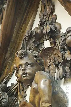To van Dievoet are attributed some finely chiseled woodcarvings, such as the elaborate lime-wood ornamentation of festoons and fruits in the collection of the Royal Museums of Art and History of Brussels.[26] He also carved wooden "keerses" - richly decorated emblems that were used for celebrations of the tailors' guild of Brussels.[25]