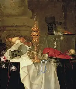 Vanitas paintings are informed by a Christian understanding of the world as a temporary place of ephemeral pleasures and torments from which humanity's only hope of escape is through the sacrifice and resurrection of Christ. While most of the symbols in vanitas still lifes reference earthly accomplishments (books, scientific instruments, etc.), pleasures (a pipe), sorrows (symbolised by a peeled lemon), death and the transience of life (skulls, soap bubbles, empty shells) and the role of chance in life (dice, playing cards), some symbols used in these paintings carry a dual meaning: a rose or an oar of grain refers as much to the brevity of life as it is a symbol of the resurrection of Christ and thus eternal life.[12] An illustration of a vanitas painting by Willebeeck is in the collection of the Snijders&Rockox House in Antwerp. It shows precious objects to refer to ideas of vanities and hollowness: the fallen rummer, the silver candle holder, tazza and Westerwald jug are all empty, the lighted cigar is about to go out, the pipe is finished and there is no further life in the shell. These objects all point to the transitory nature of the luxuries and the pleasures enjoyed in life. The peeled lemon references the bitterness of life.[13] Another vanitas still life by Willebeeck is the Vanitas with fruit, books, pocket watch, wine glass, extinguished candle and skull. It is full of vanitas symbols and may have served as the model for a similar painting by the Antwerp painter Joris van Son dated 1652.[14]