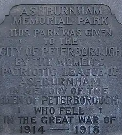 The land upon which the museum resides was donated to the City of Peterborough, and is more formally known as Ashburnham Memorial Park. A plaque at the summit reads, "This park was given to the City of Peterborough by the Women's Patriotic League of Ashburnham in memory of the men of Peterborough who fell in the Great War of 1914–1918."