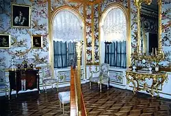 The East and West Chinese Cabinets were decorated between 1766 and 1769 to exhibit objects of decorative art imported from the East. The walls were decorated with imitation Oriental patterns by Russian craftsmen, and hung with Chinese landscape paintings in yellow and black lacquer. Another room, positioned at the centre of the palace, bears the name of the Picture Hall.