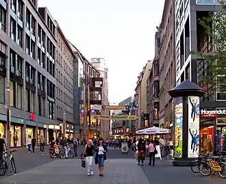 Petersstrasse is one of the oldest streets in Leipzig's district of Mitte (neighborhood Zentrum). For centuries it was a main and commercial street for the Leipzig trade fair with exhibition houses, inns and shops. In the second half of the 19th century, many of the old buildings on the street fell victim to the modernization of the city center.[1] Today it is a heavily frequented pedestrian zone in a prime location with shopping centers, department stores, shops, restaurants and cinemas.[2]