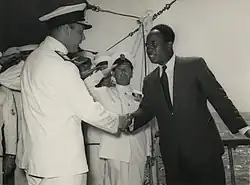 ![]() William-Powlett (left) receiving the Prime Minister of the Gold Coast, Kwame Nkrumah aboard HMS Euryalus in 1953 | |