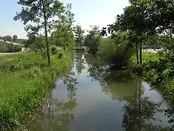 The Pfinz is a right tributary of the Rhine in Baden-Württemberg. Its origin is located at the northern edge of the Black Forest near the Straubenhardt borough of Pfinzweiler. Near Durlach it enters the Upper Rhine Plain and continues, splitting into several beds and canals, in northwesterly direction through several towns and villages north of Karlsruhe for example Staffort. The Pfinz discharges into the Rhine near Dettenheim-Rußheim. Over the course of its path the Pfinz crosses underneath two canals: one near the Karlsruhe borough of Hagsfeld and one by Dettenheim-Rußheim.