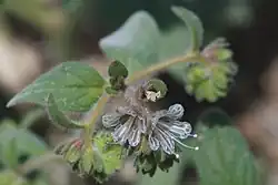 Phacelia grisea is an annual herb with a branching, erect stem reaching up to about 60 centimeters in height. It is glandular and coated in stiff hairs. The lance-shaped or oval leaves are up to 8 centimeters long and have lobed edges. The hairy inflorescence is a one-sided curving or coiling cyme of bell-shaped flowers. Each flower is about half a centimeter long and white to pale purple in color with long protruding stamens.