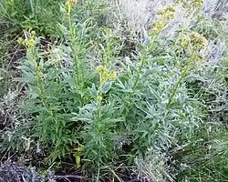 It is a perennial herb producing an erect stem from a taproot, reaching a maximum height around two meters. It is hairy in texture, some of the hairs black and glandular. The lance-shaped or oval leaves are up to 12 centimeters long and toothed or lobed along the edges.