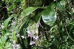 This epiphytic species is usually found at the base of the phorophytes. The plants have 1–4 elliptic-obovate, glossy, 23 cm long and 6 cm wide leaves. Fragrant, white flowers with purple transverse barring are produced on pendent, branched or unbranched inflorescences. The labellum lacks trichomes. Flowering occurs from September to November and from May to June.[3]