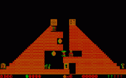 In each level, the player navigates and avoids obstacles by jumping or falling, evading or killing enemies, and find keys to exit each level. Nevada Smith has no life bar, and is killed instantly when he touches enemies or traps. Nevada Smith can collect coins and masks for extra points. Lethal obstacles include pyramid-themed traps, such as blocks that fire projectiles when Smith passes in front of them, wall spikes, ceiling spikes, floor spikes, moving spikes, and wind. Navigational challenges include moving platforms and elevators. Bonus points are randomly concealed in some bricks, which are awarded when hit from below. Occasionally, Smith will become invisible, where only his hat will be visible. The game contains many dead ends as 'traps' where Smith can become permanently stuck, forcing the player to either quit or reload a saved game. Collecting manuscripts will cause blocks to appear (though they are occasionally traps), and invisible triggers will cause blocks to disappear (usually activated around masks). Collecting an 'F' will temporarily freeze all enemies and traps. Collecting 5 masks earns the player 11,000 points and collecting 100 coins earns the player an extra life.