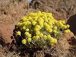 Within the Kettle River Range of Washington, P. sediformis is a noted component of the Douglas's buckwheat/Sandberg's bluegrass floral community. This community is restricted to loam soils that are derived from or impacted by surface weathered andesite rock, and are restricted in range due to the relatively rare occurrence of soils in the region. Plants within the community include the shrubby mountain big sagebrush and the perennial herbs arrowleaf balsamroot, arrowleaf buckwheat, bigseed biscuitroot, bitterroot, brittle bladderfern, blue bunchgrass, bluebunch wheatgrass, deer paintbrush, Holbøll's rockcress, limestone hawksbeard, meadow death camas, narrow leaved fleabane, nodding microseris, parsnip-flower Buckwheat, tufted phlox, upland larkspur, wallaces spikemoss, wyeth biscuitroot, and yellow fritillary.[12]