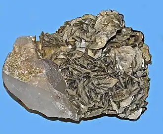 Phengite is a series name for dioctahedral micas of composition K(Al,Mg)2(OH)2(Si,Al)4O10. It is common for Mg or Fe2+ to substitute for Al on the Y site and a corresponding increase in Si on the Z site in the mica group formula X2Y4–6Z8O20(OH, F)4. Similar to muscovite but with addition of magnesium. It is a non-IMA recognized mineral name representing the series between muscovite and celadonite.[1][2]