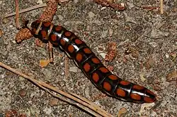 One of larvae's prey is the millipede, Floridobolus penneri.[19] The larvae attacks the millipede in three ways. The larvae kills the millipede through injecting its own intestinal fluid. Once attacked, the millipede is unable to release its glands. Third, the larvae does not pierce the glands of the millipede when feeding on it.[19] Overall, the researchers were able to understand that the larvae devours its prey without having to come into contact with the millipede's toxic secretion.[20]
