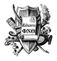 The Eclectic Society's badge is a watch key that is shaped like a scroll, bearing the Greek letters ΦΝΘ, the word "Eklektos", and the letter A in star in the upper right corner.[1] The fraternity's magazine, The Eclectic Scroll, was first published in 1926.[1] Its colors are red and cream.[1]