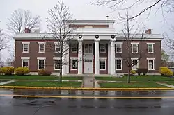 In 1906, the society hired Henry Bacon, formerly of the architectural firm McKim, Mead and White, to design a Doric Greek revival structure at 200 High Street.[6][4] Bacon was the main architect of the Wesleyan campus.[6] The three-story brick house was completed in 1907.[1] It includes 18 single rooms, 3 double rooms, a ballroom, a living room, a dining room, a kitchen, a library, and a meeting room.[6] The Alpha Eating Club was housed in the lower stories of the southern wing of the house.