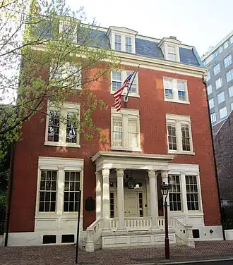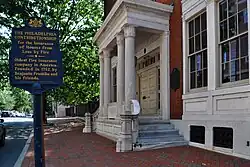 The Contributionship's building, at 212 S. 4th Street between Walnut and Locust Streets in the Society Hill neighborhood of Philadelphia, was built in 1835-36 and was designed by Thomas U. Walter in the Greek Revival style, with Corinthian columns. The portico was replaced in 1866 by Collins and Autenreith, who also expanded the living quarters on the top two floors by adding a mansard roof. A marble cornice between the third and fourth floors was also added.[1] The building was listed on the National Register of Historic Places in 1971 and was designated a National Historic Landmark in 1977.[4][6]