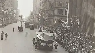 The parade, which was 2 miles long, took place on Broad Street and featured four horse-drawn howitzers, floats, marching bands led by John Philip Sousa, and brand-new floating biplanes that were built in Philadelphia's Navy Yard. Many World War I veterans along with Boy Scouts were in the parade and rode through the crowds.[6]