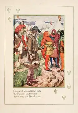 Philip's reign was plagued with crises, although it began with a military success in Flanders at the Battle of Cassel (August 1328), where Philip's forces re-seated Louis I, Count of Flanders, who had been unseated by a popular revolution.[10] Philip's wife, the able Joan the Lame, gave the first of many demonstrations of her competence as regent in his absence.