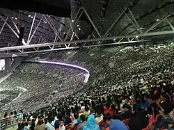 The Philippine Arena has hosted several concerts by both local and international artists. Notable acts who have performed at the venue include Blackpink, the first musical act to hold multiple nights and sell out two shows at the arena with their Born Pink World Tour;[30] Bruno Mars, the first solo artist to sell out two shows at the arena with his 2022–24 tour;[31] Coldplay, who hold the record for the highest attendance by a musical act at the arena with a combined total of 96,079 attendees during their Music of the Spheres World Tour;[32] BINI, the first local act to headline and sell out a show at the arena with their 2025 world tour;[33] and SB19, the first local act to hold and sell out two consecutive shows at the arena, and the first Filipino act to sell out a concert at the arena in less than seven hours, with their Simula at Wakas World Tour.[34][35][36][37]