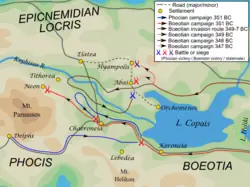 Philip had not involved himself in the Sacred War since his victory at the Crocus Field in 352 BC. In the meantime, it had become clear that the Sacred War could only be ended by outside intervention.[61] The Phocians had occupied several Boeotian cities, but were running out of treasure to pay their mercenaries; conversely, the Thebans were unable to act effectively against the Phocians.[61] The Phocian general Phalaikos was removed from his command in 347 BC, and three new generals appointed, who successfully attacked Boeotia again.[62]