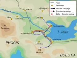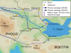 The Amphictyons seem to have concluded that their victory at Neon had effectively ended the war, and the Phocians would sue for peace.[30] Otherwise, it is difficult to understand why Pammenes did not march on Delphi, or even sack the undefended Phocian cities in the Kephisos valley.[30] In failing to follow up their victory, the Amphictyons wasted the best opportunity they had during the course of the war to end it.[30] The Thebans seem to have been so sure that the war was ended that they agreed to send 5,000 hoplites under Pammenes to help the rebellion of the Persian satrap Artabazus, shortly after the Battle of Neon.[31] The Thebans needed the money Artabazos offered them, and although they had generally been on good terms with the Persian king, they obviously felt the offer was too good to refuse.[31] It is likely the troops were dispatched before the Phocian decision to fight on became clear, unless the Thebans thought that their remaining troops were a match for any army the Phocians could field.[32] This was to prove a serious mistake for the Thebans, and the Amphictyonic cause in general.[32]