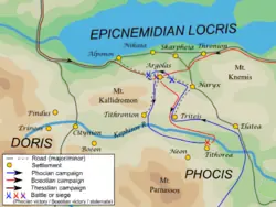 The following spring, possibly upon hearing news that the Boeotians were ready to march against Phocis, Philomelus took the initiative and marched into Epicnemidian Locris.[28] Since the Phocian army would be outnumbered by the whole Amphictyonic levy, it is probable that he sought to defeat his enemies one by one, starting with the Locrians.[28] If he could defeat the Locrians, then he was in a position to occupy the narrow pass of Thermopylae and block the union of the Thessalian and Boeotian armies, the main Amphictyonic contingents.[28] Philomelus's army thus crossed into Locris, probably using the Fontana pass from Triteis to Naryx, or possibly the Kleisoura pass from Tithronion to the same general area of Locris. The Locrians sent a force of cavalry to oppose him, which the Phocians easily defeated.[28] However, this battle gave the Thessalians time to pass through Thermopylae and arrive in Locris. Philomelus immediately attacked the Thessalians, and defeated them near the town of Argolas, whose location is not definitively known. Buckler suggests, on the basis of topographical considerations, that the modern village of Mendenitsa must be ancient Argolas.[28]