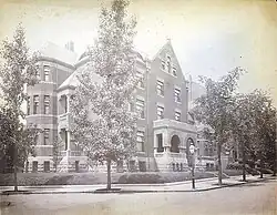 In the 1880s, she became a major benefactor and director of the Golden Gate Kindergarten Association[8] and the first president of the Century Club of California.[9] In 1902, Hearst funded the construction of a building to provide teacher training and to house kindergarten classes and the association's offices.[10] The association had 26 schools at the time of the San Francisco earthquake in 1906.[11] Hearst was a major benefactor of the University of California, Berkeley, and its first woman regent, serving on the board from 1897 until her death.[12] That year, she contributed to the establishment of the National Congress of Mothers, which evolved eventually into the National Parent-Teacher Association. In 1900, she co-founded the all-girls National Cathedral School in Washington, DC. In addition, a nearby public elementary school bears her name.[13] Hearst funded the Hearst Library in Anaconda, Montana, in 1898. She maintained it until 1904.[14]