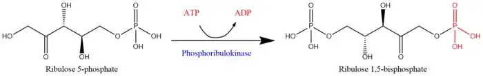 - ^ a b Miziorko HM, Eckstein F (November 1984). "The stereochemical course of the ribulose-5-phosphate kinase-catalyzed reaction". The Journal of Biological Chemistry. 259 (21): 13037–40. doi:10.1016/S0021-9258(18)90652-6. PMID 6490643.