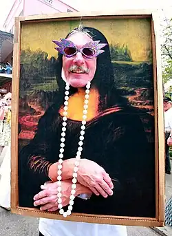 A photo stand-in (also called a face-in-hole, face in the hole board, or photo cutout board) is a large board with an image printed on it and that has one or more holes cut out where people can stick their face through the board for humorous effect.[1] The hole aligns with an area in the image that creates an optical illusion of the person's face being an actual part of the scene. This illusion is then often immortalized by taking a photograph of the person's face through the board. Photo stand-ins may be found at midways, carnivals, parties, tourist traps, theme parks and similar locations and events that people visit for entertainment. The television game show You're in the Picture revolved around celebrity guests using a photo stand-in, having to guess what scene they were in. The Dutch game show De Jongens tegen de Meisjes had a segment with a similar game from the second season onwards.