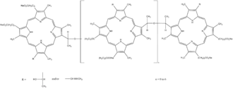 Porfimer is a mixture of oligomers formed by ether and ester linkages of up to eight porphyrin units.[1] In practice, a red light source emitting at 630 nm is used to excite the Porfimer oligomers.[2]